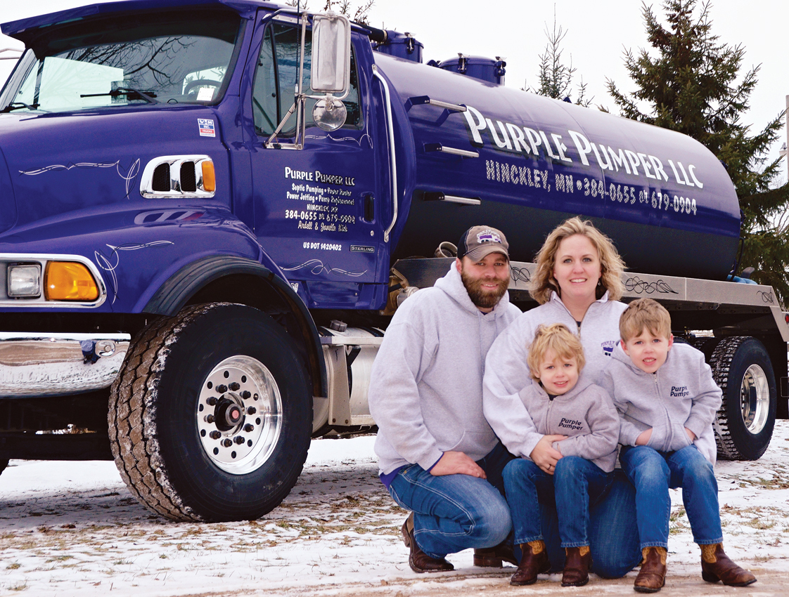 There are clear benefits to a husband and wife working together in a small-scale pumping business. Spouses with complementary skills can bring individual talents to the partnership and keep the work flowing smoothly. Ardell and Janelle Kick, of Purple Pumper in Hinckley, Minn., enjoy that kind of winning teamwork. Ardell works tirelessly in the field while Janelle brings organizational skills to the office and is always available to troubleshoot when a customer calls with an emergency.Located midway between Minneapolis-St. Paul and Duluth to the north, the Kicks serve two rural counties with the majority of their workload consisting of residential